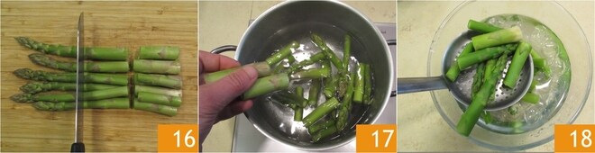 Limpe os aspargos eliminando a parte mais dura do talo, depois divida-os em 3 partes 16. Escalde os aspargos em água fervente salgada por 2-3 minutos 17, depois transfira-os para uma tigela com água fria e gelo para manter a cor viva 18.