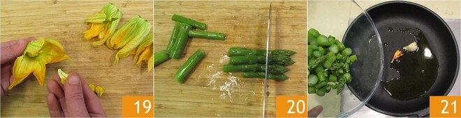 Enquanto isso, retire o pistilo das flores de abóbora 19. Corte os aspargos em rodelas 20 e refogue-os por alguns minutos em uma frigideira onde você fritou em um fio de óleo um dente de alho esmagado com casca e uma pimenta cortada ao meio 21.