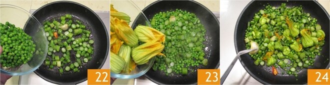 Adicione as ervilhas 22 e as flores de abóbora 23, salgue, tempere com pimenta e salteie tudo por alguns minutos. Uma vez cozidos, elimine o alho 24 e a pimenta e deixe esfriar.