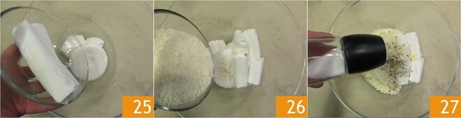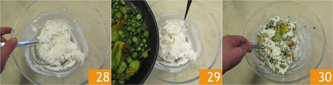 Enquanto isso, junte em uma tigela a ricota, o queijo de cabra 25 e o queijo Parmigiano Reggiano DOP ralado 26, sal 27 e pimenta.