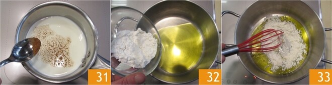 Por último, prepare o molho bechamel com óleo: despeje o leite em um panela pequena e aromatize com sal, pimenta, canela e noz-moscada 31. Enquanto isso, aqueça o óleo em outra panela pequena, depois adicione a farinha de uma vez só 32 e misture vigorosamente com um batedor 33.