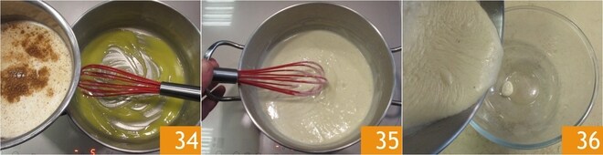 Quando você tiver obtido uma mistura dourada, adicione o leite aromatizado 34 e continue mexendo no fogo até alcançar a consistência desejada 35. Quando o molho bechamel estiver engrossado, transfira-o para uma tigela e cubra com filme plástico em contato 36.