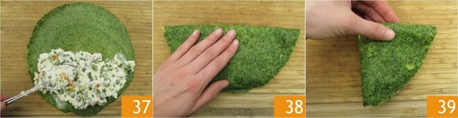 Você está pronto para rechear as crepes: coloque uma crepe na superfície de trabalho, distribua o recheio sobre metade da superfície 37 e dobre-a pela metade 38, depois dobre novamente para obter um triângulo 39. Proceda dessa forma para rechear todas as crepes, tanto as brancas quanto as verdes.