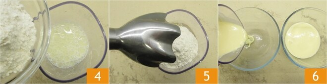 Adicione também a farinha peneirada 4 e misture com um mixer de imersão 5 até obter uma consistência lisa e homogênea. Divida a massa obtida em 2 tigelas 6.