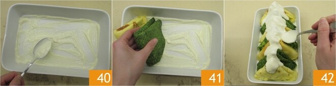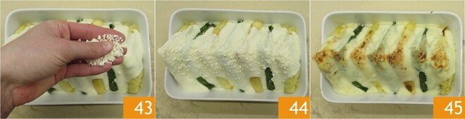 Neste ponto, cubra o fundo de uma assadeira com um pouco de molho bechamel 40, depois disponha as crepes recheadas com a ponta para cima alternando as cores 41 e cubra-as com o restante do molho bechamel 42.