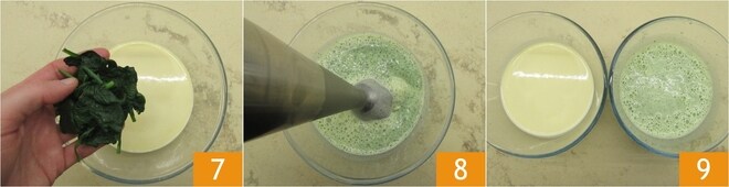 Em uma das 2 tigelas, adicione os espinafres já cozidos e escorridos 7 e bata com o mixer de imersão para misturá-los 8. Quando ambas as misturas estiverem prontas, prossiga com o cozimento 9.
