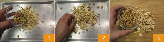 Para preparar o crocante, primeiro torre as nozes: coloque em uma assadeira os pinhões, os pistaches, as amêndoas e as avelãs 1, distribuindo-os pela assadeira 2 e torando-os no forno estático pré-aquecido a 180° por 5 minutos. Depois de torrados, coloque as nozes em uma tábua de corte e adicione também os miolos de nozes 3.