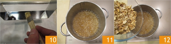 Unte a borda interna da forma 10. Enquanto isso, o xarope terá se tornado de cor âmbar e aparecerão bolhas na superfície 11. Neste ponto, adicione as nozes 12.