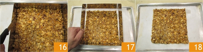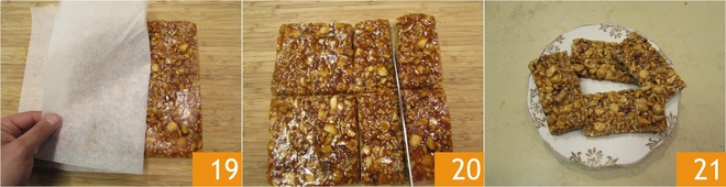 Vire o crocante sobre uma tábua de corte, remova o papel manteiga 19 e corte em 8 pedaços iguais 20. Deixe descansar até que as barras estejam completamente consolidadas e endurecidas. Depois, você pode transferir o crocante para um prato de servir 21!