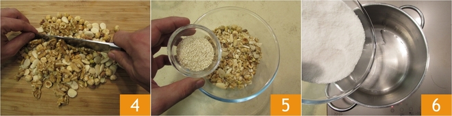 Pique tudo grosseiramente com uma faca 4. Despeje a mistura em uma tigela, adicione o gergelim 5 e misture. Agora cuide do caramelo: em uma panela, despeje a água e o açúcar 6.