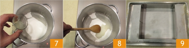 Adicione também o suco de limão 7, mexa com uma colher 8 e deixe derreter até que o xarope atinja a temperatura de 140°. Pegue uma forma quadrada sem fundo de 20x20 cm e coloque-a sobre uma assadeira forrada com papel manteiga 9.