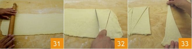 Finalmente, retome a massa e estenda-a a uma espessura de cerca de 2-3 mm até obter um retângulo de 75 cm de largura e 15 cm de comprimento. A partir disso, você deve cortar 15 triângulos com base de 10 cm e altura de 15 cm 32. Neste ponto, segure firmemente com uma mão a base de um dos triângulos e com a outra mão alongue delicadamente a massa para aumentar seu comprimento em 1/4 33.