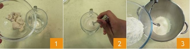 Para preparar os croissants salgados, a primeira coisa é começar a fazer a massa folhada. Dissolva o fermento na água em temperatura ambiente (1-2). Em uma batedeira equipada com gancho, coloque as duas farinhas 3,