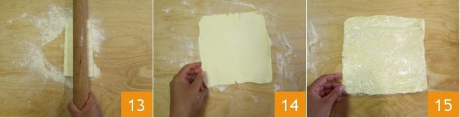 e, acrescentando um pouco de farinha, estenda-a com o rolo 13 até obter um quadrado de 20x20 com cerca de meio cm de espessura 14. Embrulhe em filme plástico 15 e coloque na geladeira.