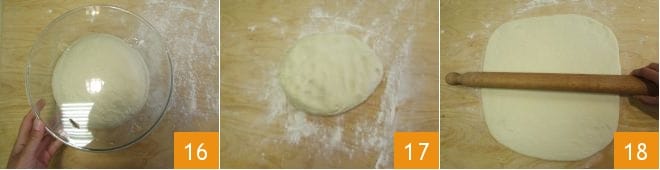 No final da fermentação 16, transfira a massa para uma superfície enfarinhada 17 e, ainda com o rolo, estenda-a até obter um quadrado de 30x30 cm 18.