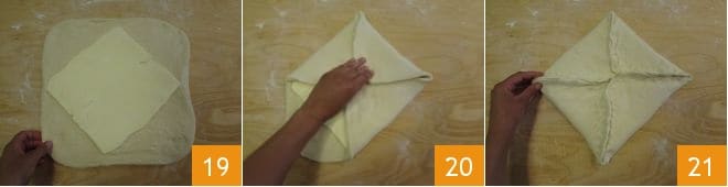 Coloque o bloco de manteiga no centro do quadrado para formar um losango 19. Em seguida, dobre as extremidades da massa subjacente em direção ao centro do bloco de manteiga 20, juntando as bordas, mas sem sobrepô-las. Sele as extremidades com os dedos 21. Deixe repousar na geladeira por 10-15 minutos.