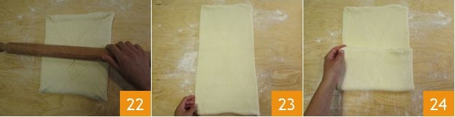 Coloque novamente o quadrado obtido em uma superfície levemente enfarinhada e estenda-o para alongar apenas um dos lados 22 até obter um retângulo de 44 cm de comprimento e meio cm de espessura. Em seguida, faça a primeira dobra em 3, trazendo uma parte da massa até 1/3 do retângulo 24