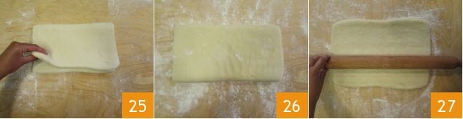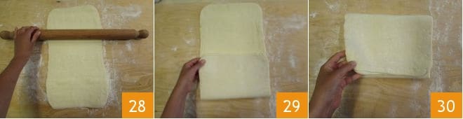 e cubra com a outra parte 25: a primeira dobra está pronta. Cubra com filme plástico e deixe descansar por pelo menos 30 minutos na geladeira. Retome a massa e coloque sempre sobre a superfície enfarinhada 26; estenda na direção das dobras 27
