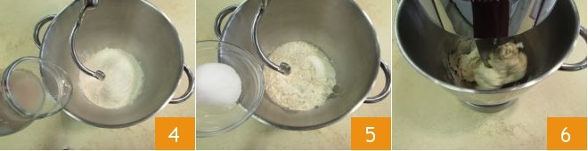 em seguida, adicione o fermento 4 e o açúcar 5. Ligue a batedeira até obter uma massa homogênea 6.