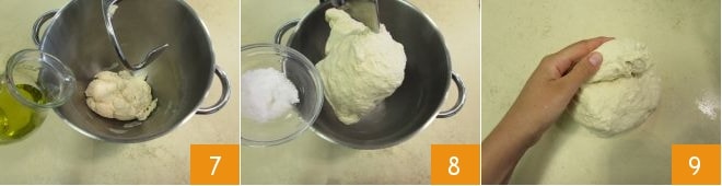 Depois, adicione o óleo 7 e deixe incorporar até que a massa esteja bem ligada ao gancho. Por último, adicione o sal 8 e trabalhe por mais alguns minutos até que seja absorvido 8. Transfira para uma superfície de trabalho 9