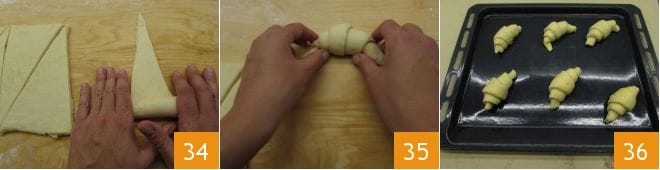 Agora, só resta enrolar seu croissant a partir da base sem apertar nem pressionar muito 34. Você deve obter 2 voltas completas, ou seja, 3 voltas 35. Prepare todos os croissants dessa forma e coloque-os gradualmente em uma assadeira, espaçando-os bem.