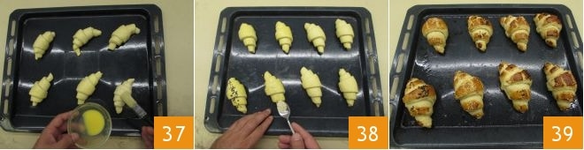Pincel a superfície com uma gema batida 37 e decore alguns croissants com sementes de gergelim branco e outros com sementes de gergelim preto 38. Deixe levedar por uma hora e meia em temperatura ambiente. Asse em forno ventilado pré-aquecido a 200° por 30 minutos, verificando o cozimento sem abrir o forno até que estejam bem dourados. Retire do forno 39 e deixe esfriar antes de cortar e rechear seus croissants salgados.