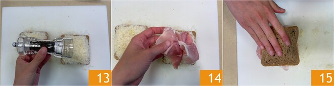 Adicione pimenta 13 e recheie com as fatias de presunto 14. Feche uma fatia sobre a outra, mantendo o recheio dentro, pressione levemente com a palma da mão 15.