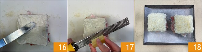 Agora espalhe mais molho bechamel na superfície 16, rale mais queijo 17 e transfira os croque monsieur para uma assadeira forrada com papel manteiga 18. Asse em forno ventilado pré-aquecido a 190°C por 12 minutos ou até dourar.