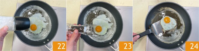 Adicione sal 22 e pimenta 23, cozinhe por cerca de 3 minutos, até que o fundo do ovo fique crocante 24.