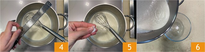 Deixe o molho ferver em fogo baixo, mexendo sempre com o batedor de arame. Rale a noz-moscada 4, adicione sal e pimenta 5. Uma vez engrossado, transfira o molho bechamel para uma tigela 6.