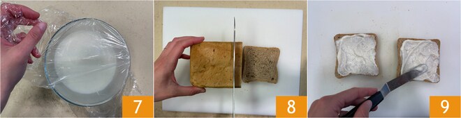 Cubra o molho com filme plástico em contato e deixe esfriar 7 na geladeira. Corte o pão em fatias 8, espalhe o molho bechamel em duas fatias 9.