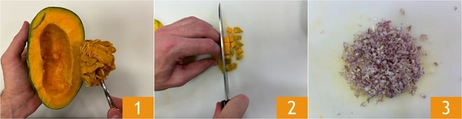 Para preparar os croquetes de arroz com abóbora e stracchino, primeiro retire as sementes e a casca da abóbora 1, depois corte-a em cubos de meio cm 2. Limpe e pique a cebola 3.