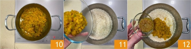 Quando a abóbora estiver macia 10, adicione-a ao arroz cozido e escorrido 11, depois adicione também a cebola 12 e perfume com a manjerona.