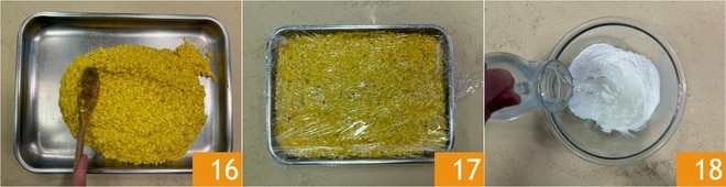Espalhe o arroz em uma assadeira grande 16 e deixe esfriar, depois cubra com película aderente 17 e leve à geladeira para firmar por cerca de uma hora. Agora prepare a massa: em uma tigela, adicione a farinha e a água 18.