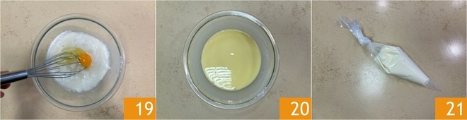 Adicione uma pitada de sal e o ovo, depois misture com um batedor de arame 19 para obter uma massa lisa e sem grumos 20. Transfira o stracchino para um saco de confeitar 21.