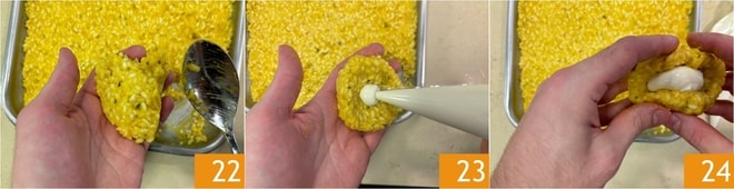 Retire o arroz da geladeira, pegue uma colher 22, achate para formar um disco e esprema no centro um pouquinho de stracchino 23. Feche o disco envolvendo o queijo com o arroz 24.