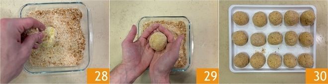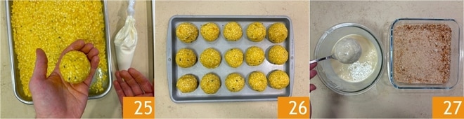 Forme uma esfera 25 e coloque em uma bandeja 26. Continue assim até terminar os ingredientes. Agora mergulhe os croquetes na massa 27.