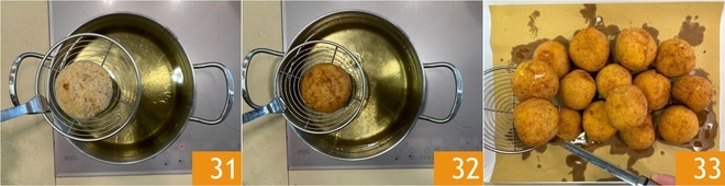 Frite em óleo vegetal quente a 180º 31, cuidando para mergulhar poucos pedaços de cada vez para não baixar a temperatura do óleo. Quando estiverem dourados, escorra 32 em papel toalha 33, adicione sal e sirva quentes os seus croquetes de arroz com abóbora e stracchino!