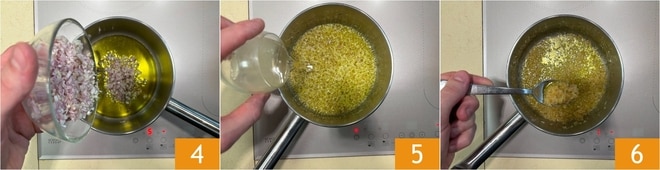 Aqueça um fio de azeite em uma panela, adicione a cebola picada 4 e deixe refogar no óleo por cerca de 10 minutos em fogo médio-baixo. Neste ponto, adicione o vinho branco 5, deixe o álcool evaporar e cozinhe em fogo baixo por 5 minutos. Uma vez pronto, reserve o refogado 6.
