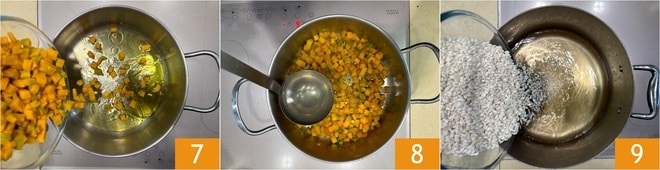 Em uma panela, aqueça mais um fio de azeite, adicione os cubos de abóbora 7 e doure-os levemente, depois adicione sal, pimenta e cozinhe por 15 minutos adicionando cerca de 200 g de caldo de legumes 8. Enquanto isso, ferva o arroz em 700 g de caldo de legumes por 12 minutos 9.