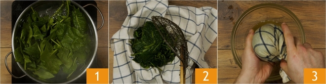 Para preparar a receita das croquetes de espinafre, primeiro ferva os espinafres por cerca de 3-4 minutos 2, depois escorra bem num pano de prato 2 3.