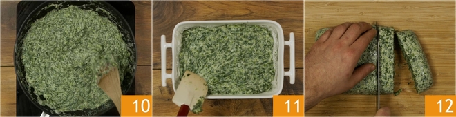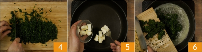 Pique-os com a faca 4. Derreta a manteiga em uma frigideira 5, adicione os espinafres 6 e refogue por cerca de 2 minutos sem deixá-los crocantes.