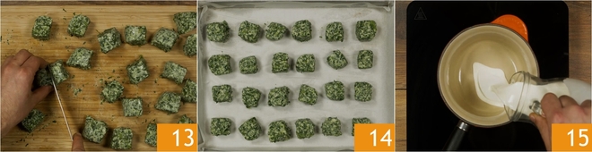 Você deve obter pedaços de cerca de 3 cm de lado com cerca de 2 cm de altura 13. Transfira-os para uma bandeja forrada com papel manteiga 14 e deixe no freezer por uma hora, para que possam ser empanados mais facilmente. Prepare um molho de gorgonzola: aqueça o creme de leite 15.