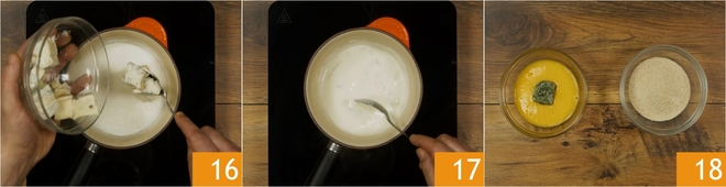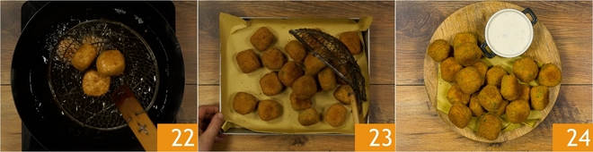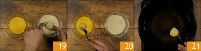 Depois na farinha de rosca 19, e novamente no ovo 20 e farinha de rosca, dessa forma você obterá uma crosta mais crocante. Depois de feitas todas, frite-as em óleo quente a cerca de 170° 21.