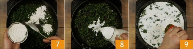 Adicione a farinha 7 e misture. Quando estiver completamente absorvida, adicione o leite 8, tempere com noz-moscada, sal e pimenta 9.