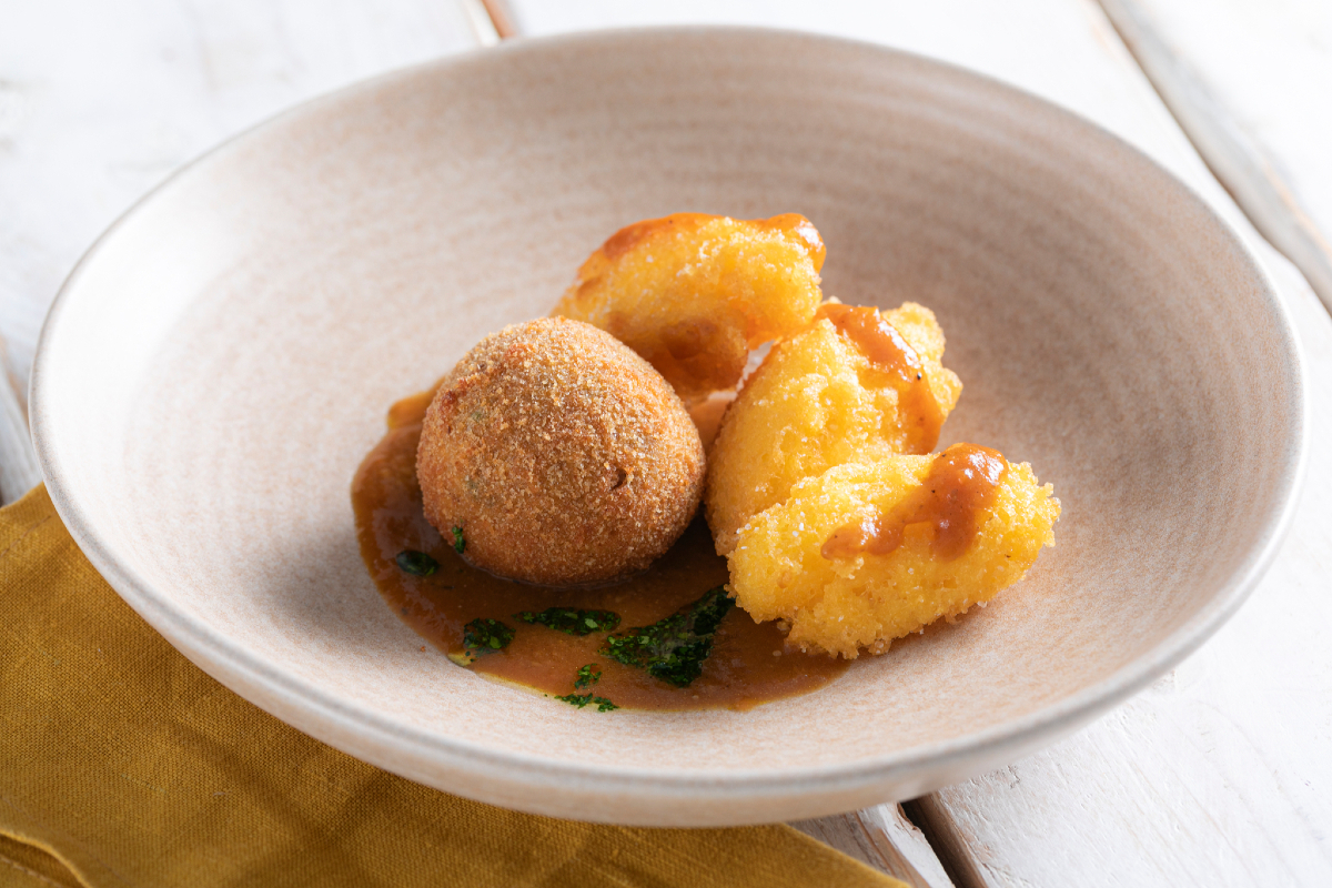A carne tenra e suculenta do ossobuco de vitela se funde com o sabor rico e amanteigado do tutano e com o aroma da típica gremolada, tomando a forma de fragrantes almôndegas douradas. Para acompanhar, não a polenta usual, mas sim quenelles crocantes de Polenta frita para um segundo prato estimulante e apetitoso. Traga à mesa a tradição em uma nova roupagem com nossos irresistíveis croquetes de ossobuco, perfeitos para enriquecer um Cuoppo alla milanese!