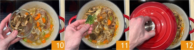 Adicione também os cogumelos secos escorridos 10, a sálvia e algumas folhas de alecrim 11. Cubra com a tampa 12 e cozinhe em forno estático pré-aquecido a 170° por cerca de 80 minutos (se você usou uma panela não adequada para forno, pode transferir tudo para uma assadeira antes de adicionar o caldo, os cogumelos e as ervas aromáticas).