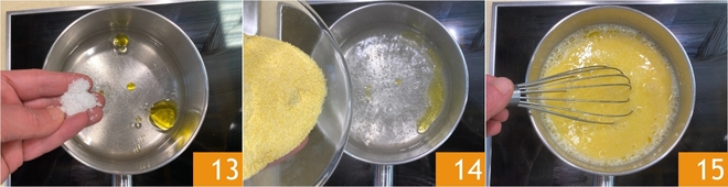 Enquanto isso, você pode se ocupar da polenta: em uma panela, coloque a água, o óleo e o sal 13. Leve a ferver, depois adicione a farinha de milho em chuva 14 e misture bem com um batedor 15.