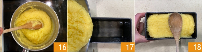 Cozinhe em fogo baixo por cerca de 45 minutos, mexendo de vez em quando, até engrossar 16. Assim que estiver pronta, transfira a polenta para uma forma 17 e nivele a superfície 18. Cubra com filme plástico e deixe esfriar completamente à temperatura ambiente.