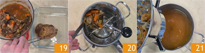 Após o tempo de cozimento da carne, retire o ossobuco da panela e reserve 19. Passe o fundo de cozimento com os vegetais por um passador de vegetais 20 para obter um molho 21.